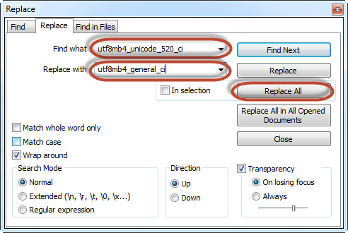 3. Kemudian pada textfield “Find what” isikan dengan “utf8mb4_unicode_520_ci” (tanpa tanda kutip) dan pada textfield “Replace with” isikan dengan “utf8mb4_general_ci” (tanpa tanda kutip) dan jalankan “Replace All”