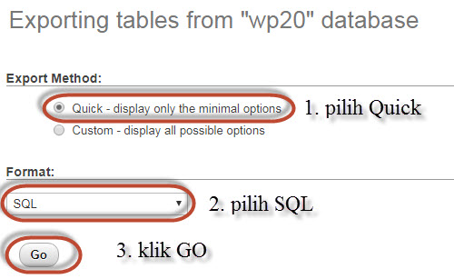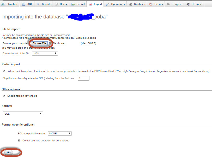 Klik Choose File, dan pilih database yang sudah di export sebelum nya pada poin 1. Ingat, ekstensi nya adalah .sql. Lalu klik Go.
