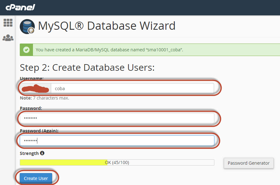 Jangan lupa untuk mencatat Username dan nama Database yang sduah dibuat.