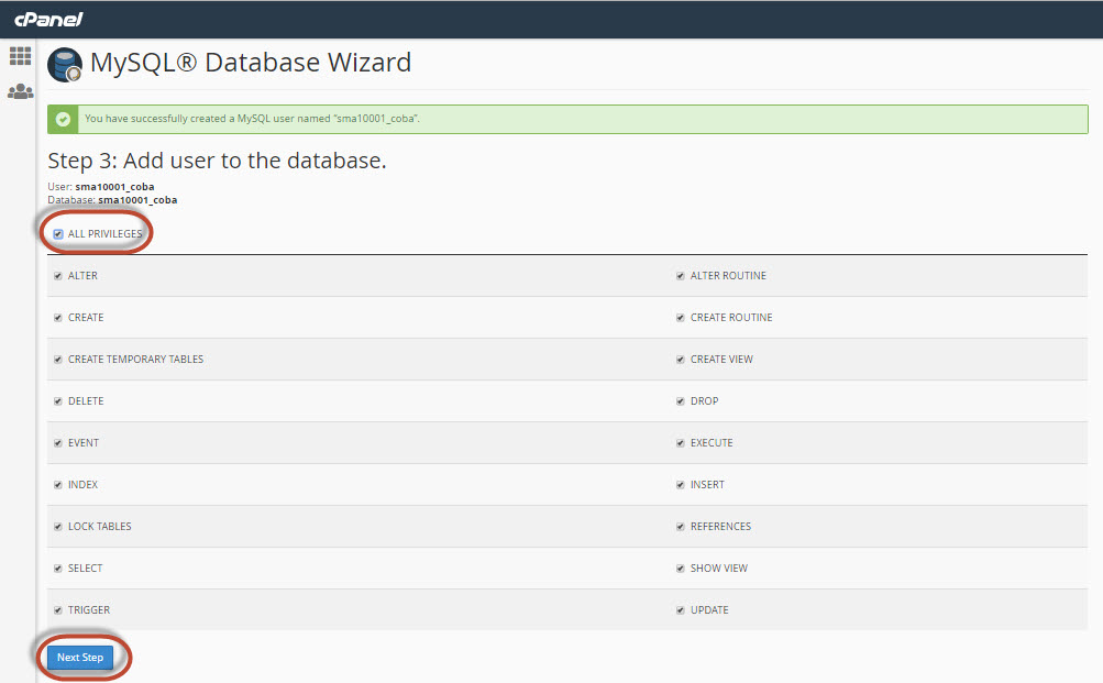 Centang bagian All Privilages untuk memberitahu cPanel bahwa kita adalah pemilik account ini dan kita berhak melakukan apa saja pada database ini. Lalu klik Next Step.