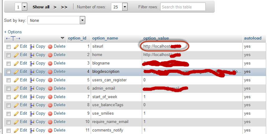 Nanti akan muncul absolute URL dari database tersebut. Itulah URL yang sekarang sedang mengarah di database wordpress. Copy URL tersebut :