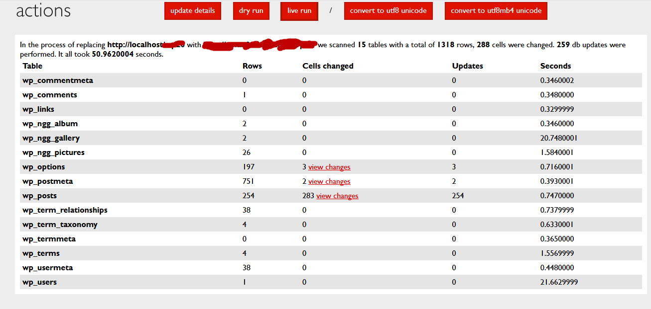 Setelah sudah yakin URL nya, database, username & password benar semua, di vagian action klik Live Run. Dan tunggu beberapa saat sampai tool berhasil meng-konversi semua URL. Setelah itu, maka proses migrasi sudah 100% selesai dan web yang sudah di hosting bisa digunakan dengan baik.