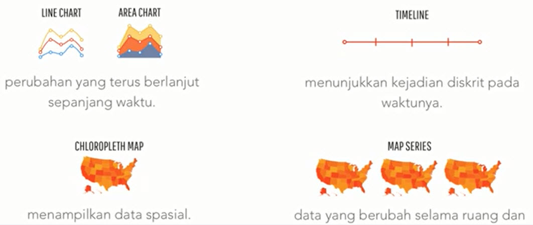 - Ekplorasi : tidak ada poin tertentu dalam ekplorasi, gaya visualisasi benar-benar akan bergantung pada spesifikasi data yang dimiliki. Kita harus memiliki semua yang dibutuhkan untuk memilih grafik yang sesuai untuk setiap rangkaian data yang ingin divisualisasikan. Pikirkan saja informasi apa yang ingin ditekankan, dan pilahlan bagan yang sesuai dengan itu