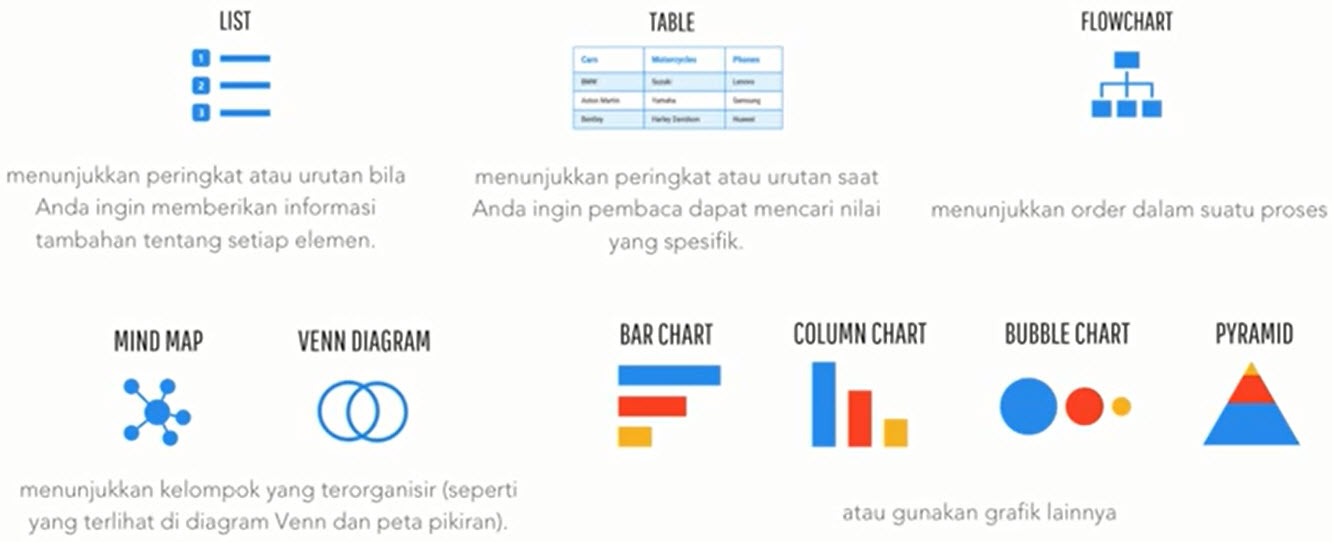- Menginformasikan data : buat statistik menonjol dengan teks besar dan berani dan berwarna, buat perhatian ekstra dengan memasang ikon dengan teks, sorot dengan bagan atau pictogram