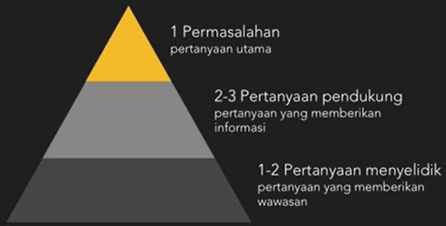 - Gunakan piramida pertanyaan : gunakan piramida pertanyaan untuk mengatasi masalah dan mengubahnya menjadi 3-5 pertanyaan yang bisa ditindaklanjuti untuk ditangani