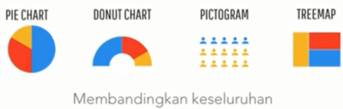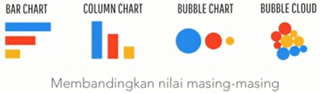 - Ekplorasi : tidak ada poin tertentu dalam ekplorasi, gaya visualisasi benar-benar akan bergantung pada spesifikasi data yang dimiliki. Kita harus memiliki semua yang dibutuhkan untuk memilih grafik yang sesuai untuk setiap rangkaian data yang ingin divisualisasikan. Pikirkan saja informasi apa yang ingin ditekankan, dan pilahlan bagan yang sesuai dengan itu