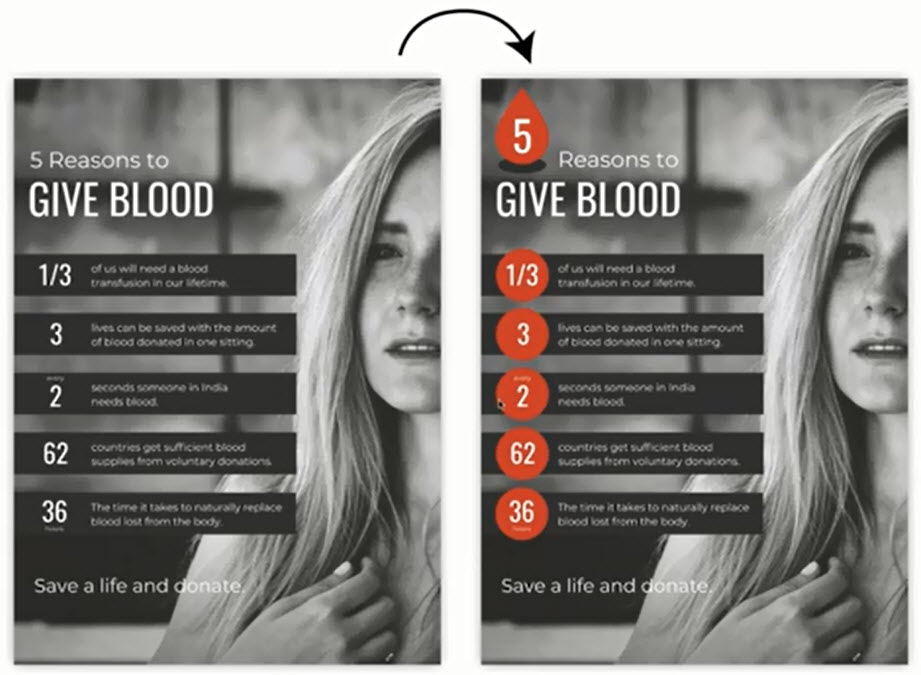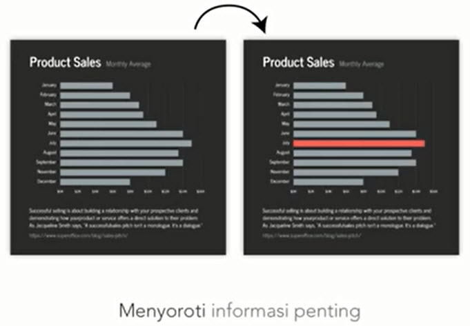 - Menginformasikan data : buat statistik menonjol dengan teks besar dan berani dan berwarna, buat perhatian ekstra dengan memasang ikon dengan teks, sorot dengan bagan atau pictogram