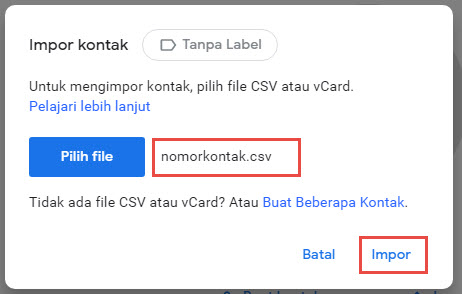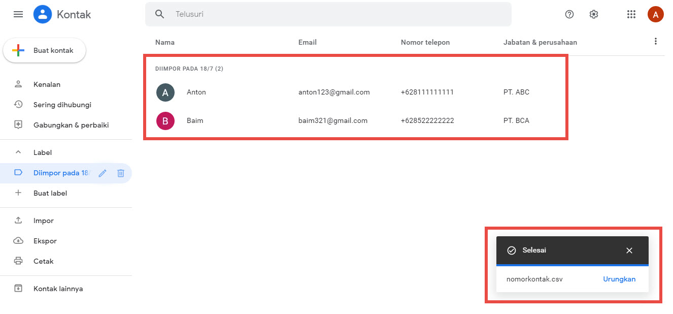 - Jika berhasil import sebelah kanan bawah ada notifikasi Selesai dan nomor kontak sudah tersimpan