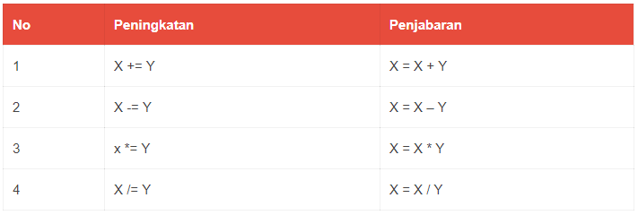 X += 2 // x = x + 2 //penulisan di bawah juga berlaku X *= Y * 3 // x = x * (y + 3)