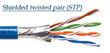 - Kabel STP (Shielded Twisted Pair) yang merupakan salah satu jenis kabel yang digunakan dalam jaringan komputer. Kabel ini berisi 4 pasang kabel (8 kabel) yang setiap pasang dipilin. Kabel STP lebih tahan terhadap gangguan yang disebabkan posisi kabel yang tertekuk. Pada kabel STP attenuasi akan meningkat pada frekuensi tinggi sehingga menimbulkan crosstalk dan noise signal.