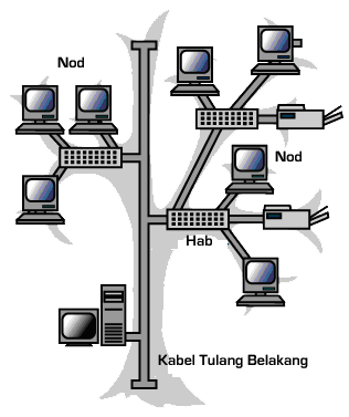 Topologi pohon bergabung dengan topologi bintang untuk membentuk topologi bus. Dalam bentuk yang paling sederhana, hanya perangkat hub yang terhubung langsung ke bus pohon, dan setiap hub berfungsi sebagai akar dari pohon perangkat. Dengan hybrid antara bus dan bintang ini mendukung perluasan jaringan dengan jauh lebih baik daripada bus atau bintang saja.