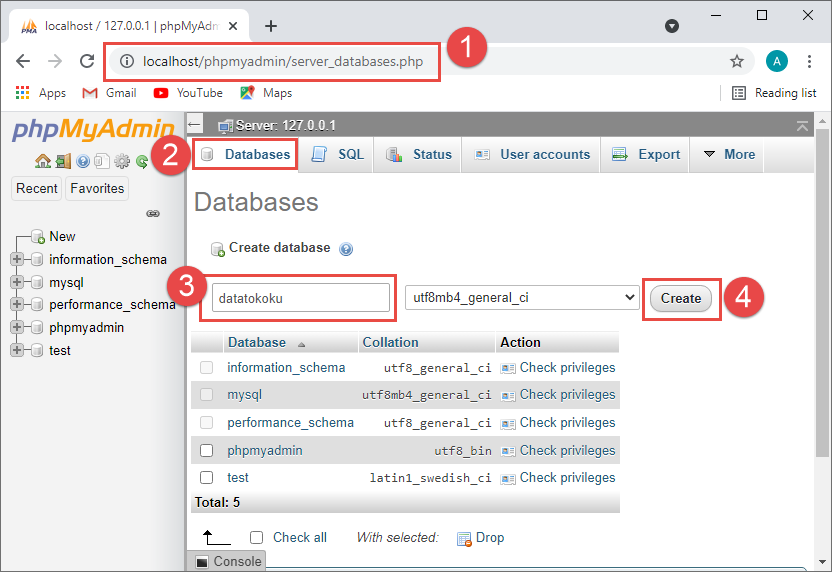 Selanjutnya buka phpMyAdmin pada alamat http://localhost/phpmyadmin pada browser yang kita gunakan (misal mozila Firefox atau Google Chrome) untuk membuat database. Masukkan nama database sesuai keinginan kita, misalnya DataTokoku, lalu klik tombol “create” atau “buat”.
