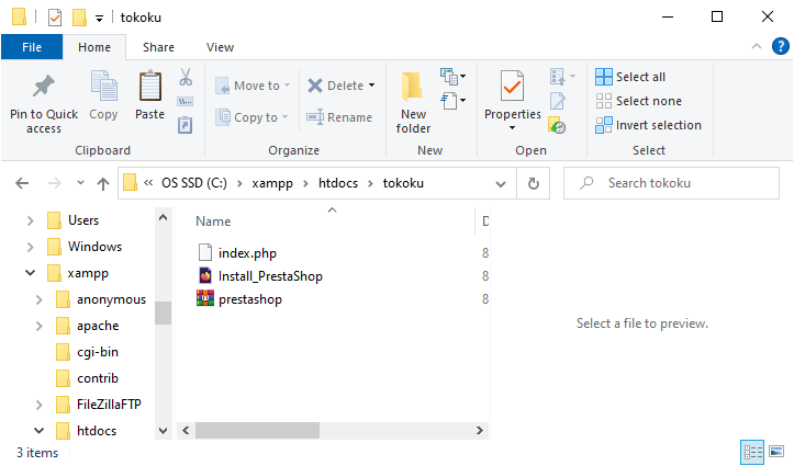 Langkah selanjutnya ekstrak file Prestashop yang telah didownload sebelumnya, nama file yang didownload pada saat tutorial ini ditulis bernama prestashop_1.7.7.7.zip. Lalu pindahkan (cut & paste) file pada folder tersebut ke folder project yang akan kita gunakan di dalam folder htdocs, pada tutorial ini nama foldernya tokoku yang berada pada direktori “C:\xampp\htdocs\tokoku”.