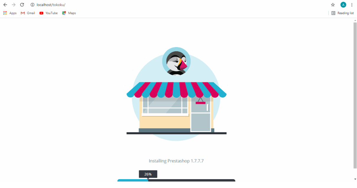 Selanjutnya buka tab baru pada browser dan isi dengan alamat http://localhost/namafolderproject, pada contoh ini nama foldernya tokoku sehingga linknya menjadi http://localhost/tokoku lalu klik Enter, tunggu instalasi sampai selesai 100%.