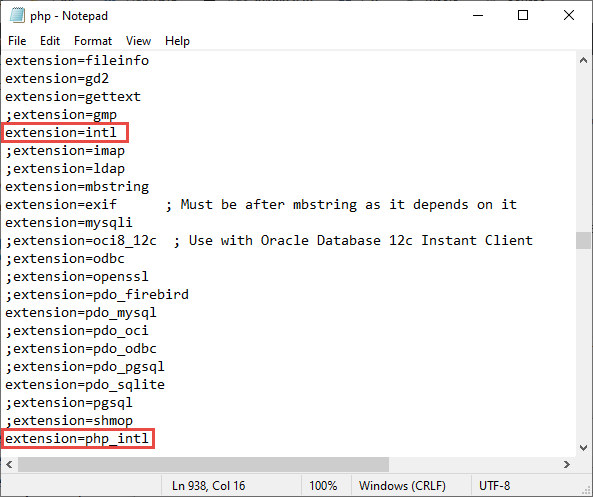 - php.ini akan terbuka dengan Notepad atau text editor defaultnya, tekan Ctrl+F pada keyboard dan cari (search) ;extension=intl dan hapus tanda titik koma (;) dan tambahkan skrip extension=php_intl