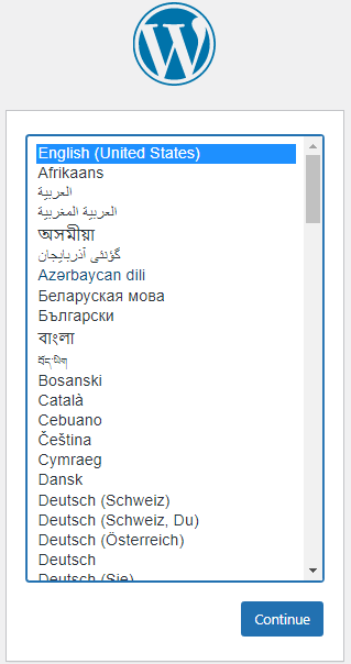 Kita lanjutkan install atau setup wordpress di localhost dengan membuka wordpress project kita di browser dengan URL localhost/[nama folder wordpress], pada contoh ini menggunakan url http://localhost/wpblog, maka kita akan didirect ke http://localhost/wpblog/wp-admin/setup-config.php. Pada langkah ini, silahkan pilih bahasa yang ingin digunakan, misalkan bahasa indonesia atau english, pada contoh ini memilih English, kemudian klik lanjutkan atau continue.