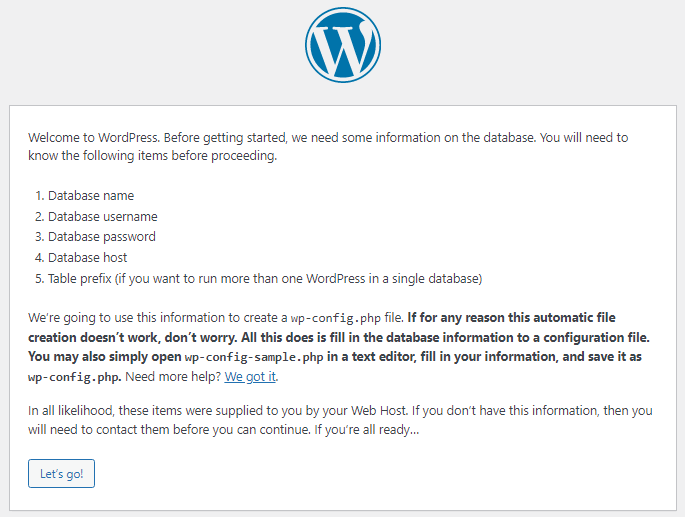 Setelah klik continue, akan tampil halaman yang berisi informasi bahwa sebelum melanjutkan proses installasi, kita harus sudah menyiapkan database name, database username, database password, database host dan table prefix. Silahkan klik tombol Let’s go!