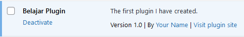 Simpan, jika berhasil akan tersedia di site bagian Plugins : Jika ingin dibagikan publik, buat sebuah file readme. Isi file tersebut menjelaskan isi plugin yang dibuat. Bisa dibuat manual lalu disimpan bersama file php atau menggunakan Plugin Readme Generator.