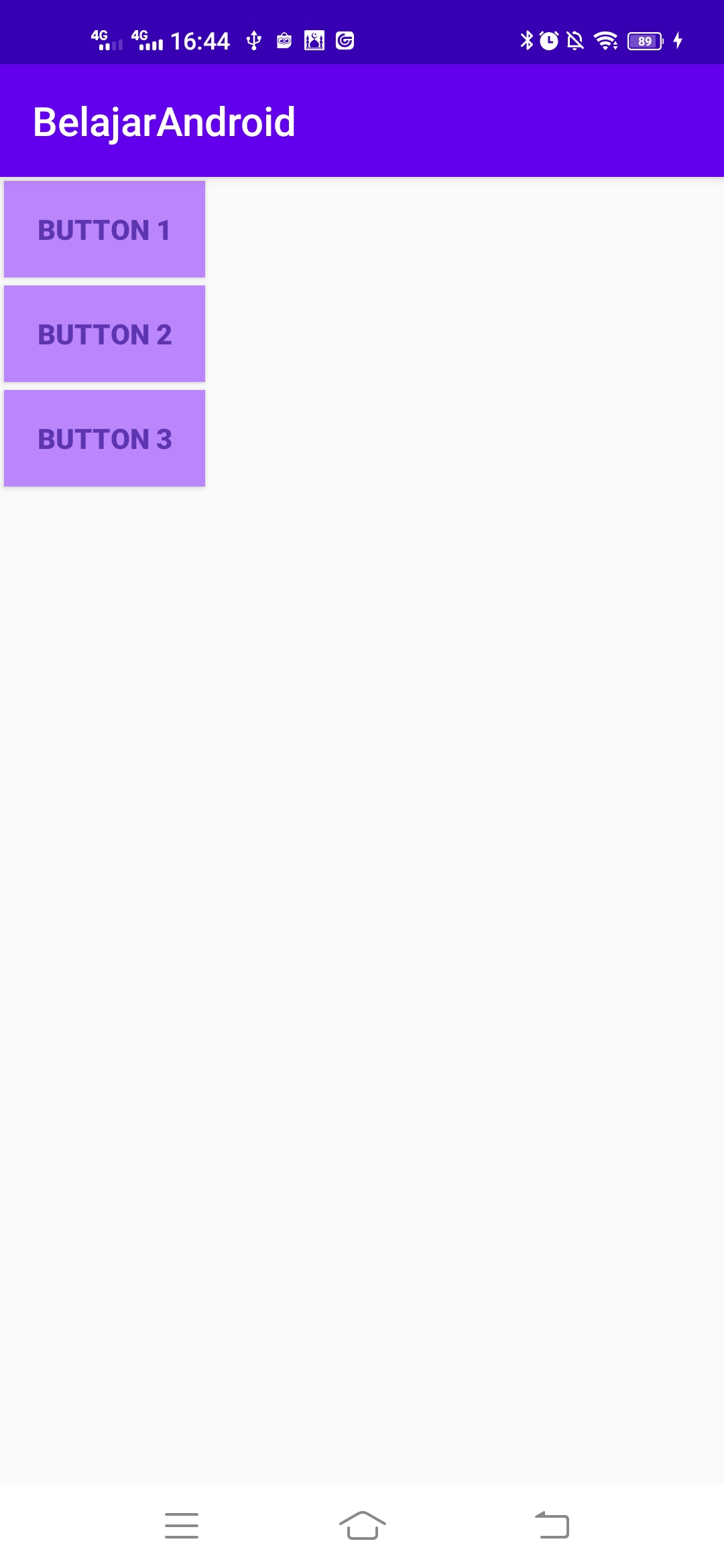 <?xml version="1.0" encoding="utf-8"?> <LinearLayout xmlns:android="http://schemas.android.com/apk/res/android" xmlns:app="http://schemas.android.com/apk/res-auto" xmlns:tools="http://schemas.android.com/tools" android:layout_width="wrap_content" android:layout_height="wrap_content" android:orientation="vertical" android:layout_gravity="center" tools:context=".LinearLayoutVertical"> <Button android:layout_width="100dp" android:layout_height="wrap_content" android:layout_margin="2dp" android:background="@color/purple_200" android:text="Button 1" android:textColor="#5E35B1" android:textStyle="bold" /> <Button android:layout_width="100dp" android:layout_height="wrap_content" android:layout_margin="2dp" android:background="@color/purple_200" android:text="Button 2" android:textColor="#5E35B1" android:textStyle="bold" /> <Button android:layout_width="100dp" android:layout_height="wrap_content" android:layout_margin="2dp" android:background="@color/purple_200" android:text="Button 3" android:textColor="#5E35B1" android:textStyle="bold" /> </LinearLayout>