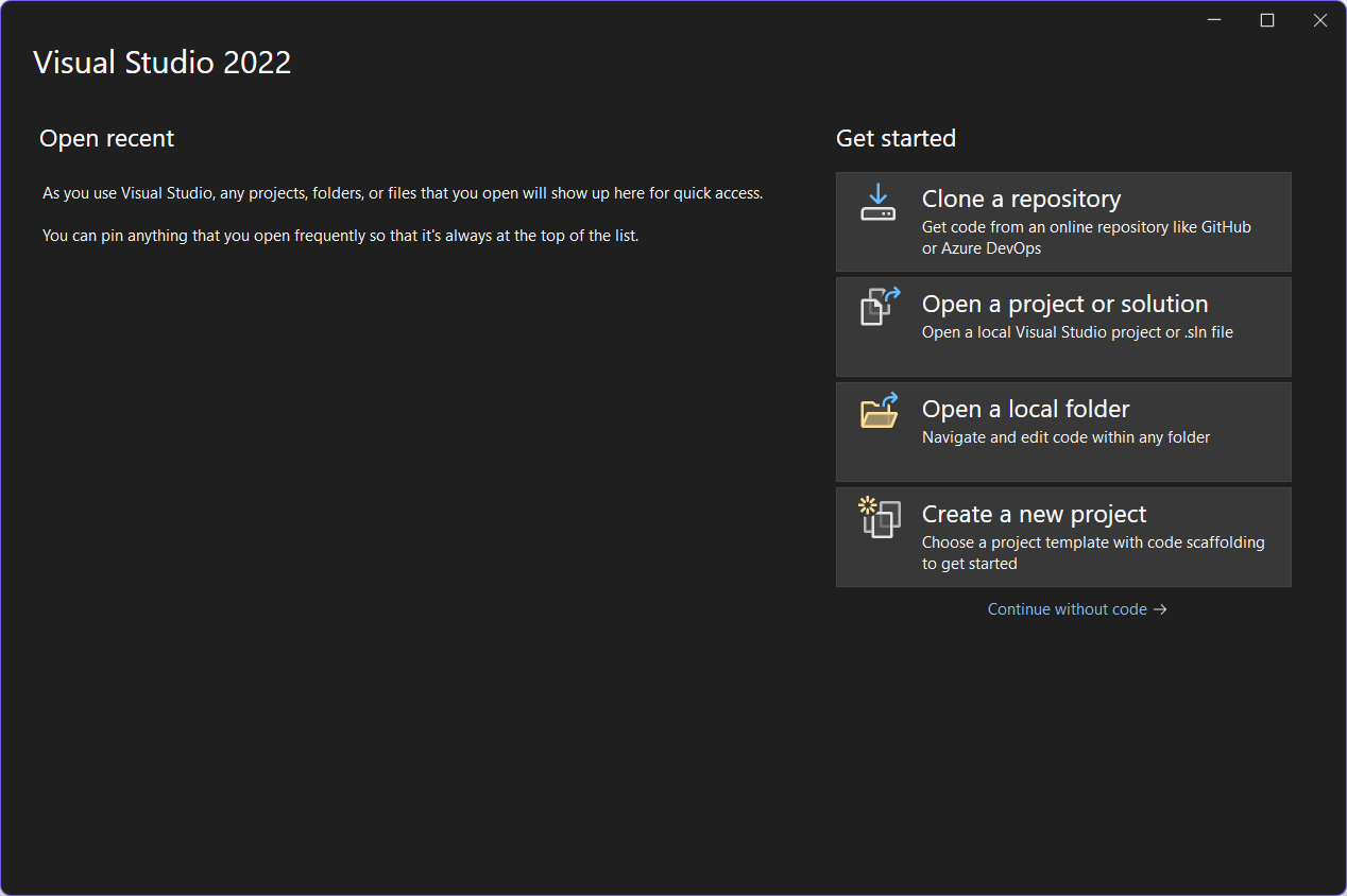 - Berikut ini tampilan Visual Studio saat baru pertama dibuka