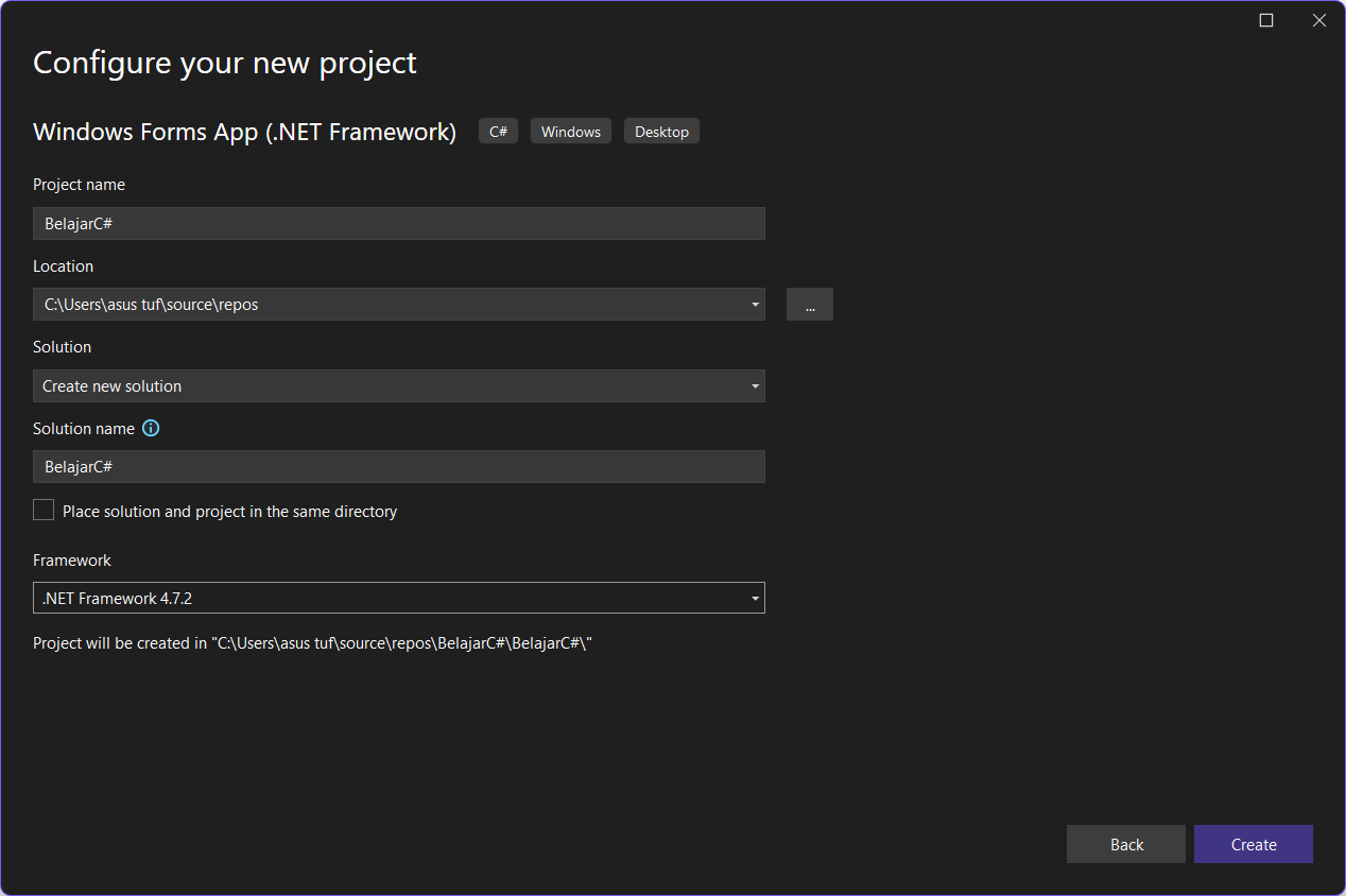 - Selanjutnya kita beri nama project kita, misal dengan nama BelajarC#, kemudian klik create