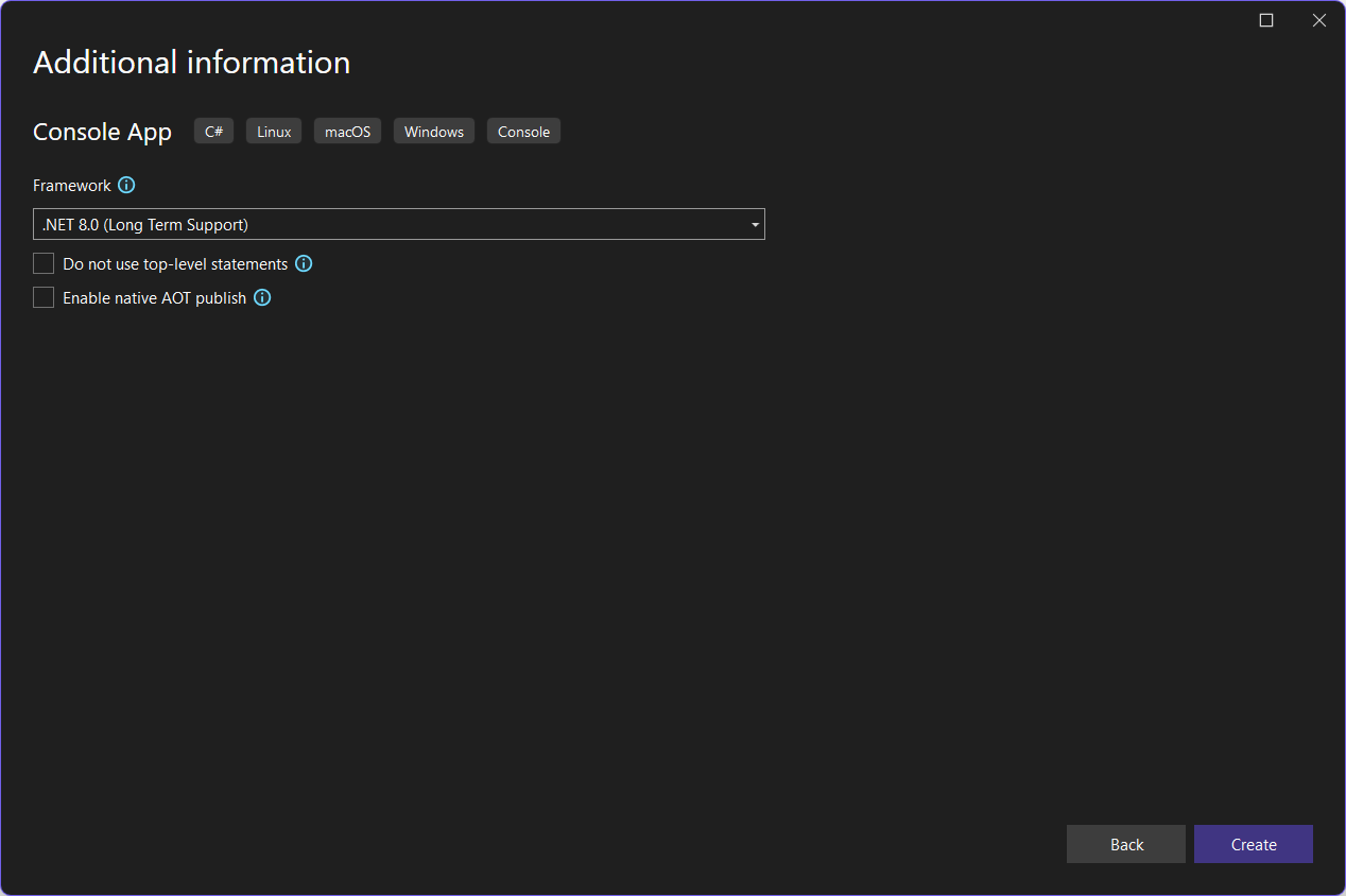 - Selanjutnya pilih .NET yang akan digunakan. pada contoh ini memilih .NET 8.0(Long Term Support), kemudian klik Create.