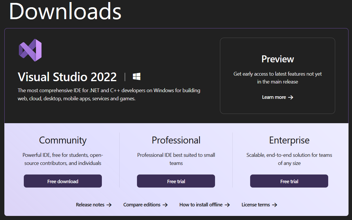Jika ingin menggunakan Visual Studio di perusahaan, baiknya pakai yang versi Enterprise dan biasanya lisensinya dibayar oleh perusahaan. Secara detail, perbedaan dari ketiga versi ini bisa kamu lihat di Compare Visual Studio 2022 Editions.