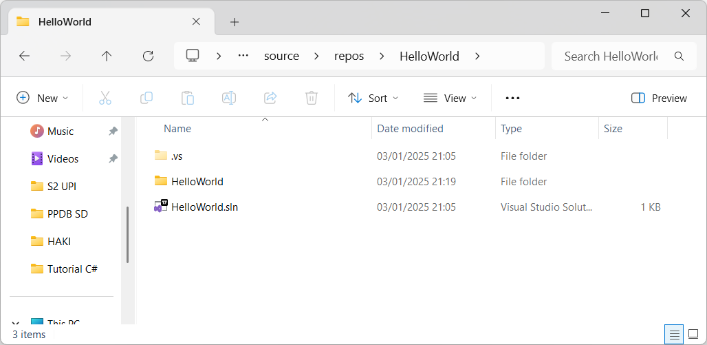 File HelloWorld.sln (solution) adalah file teks yang berisi definisi dari project. Lalu folder HelloWorld adalah folder yang berisi source code dari project HelloWorld.