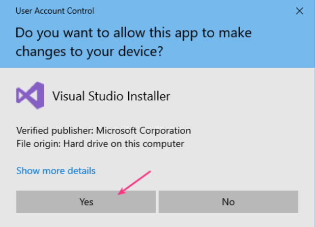 - Maka akan tampil jendela Visual Studio Installer, klik Continue untuk melanjutkan.