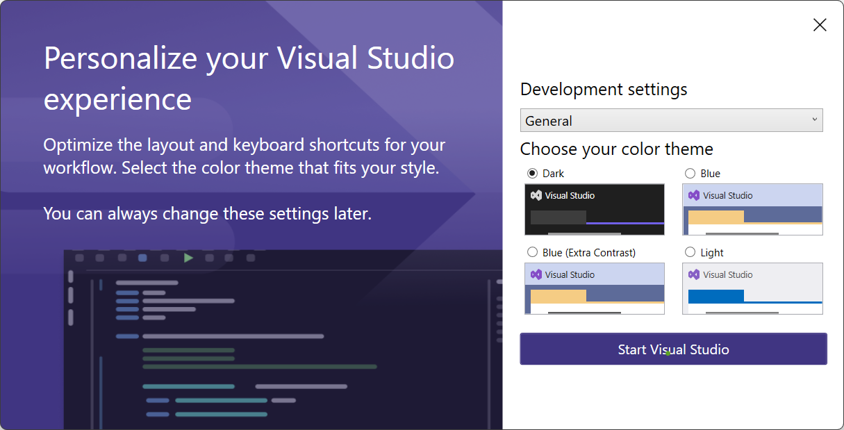 - Berikutnya kita akan diminta untuk menentukan setting dan tema. Pilihlah tema yang kamu sukai, kemudian klik Start Visual Studio untuk mulai menggunakan Visual Studio.