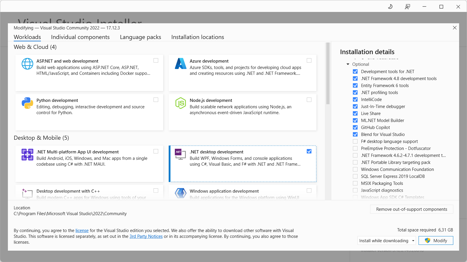 - Karena kita akan menggunakan Visual Studio untuk coding C#, silakan centang .NET Desktop Development. Pada proses ini koneksi internet kita harus cepat dan stabil. Instalasi ini membutuhkan ruang kosong pada komputer kita minimal 6,31 GB.