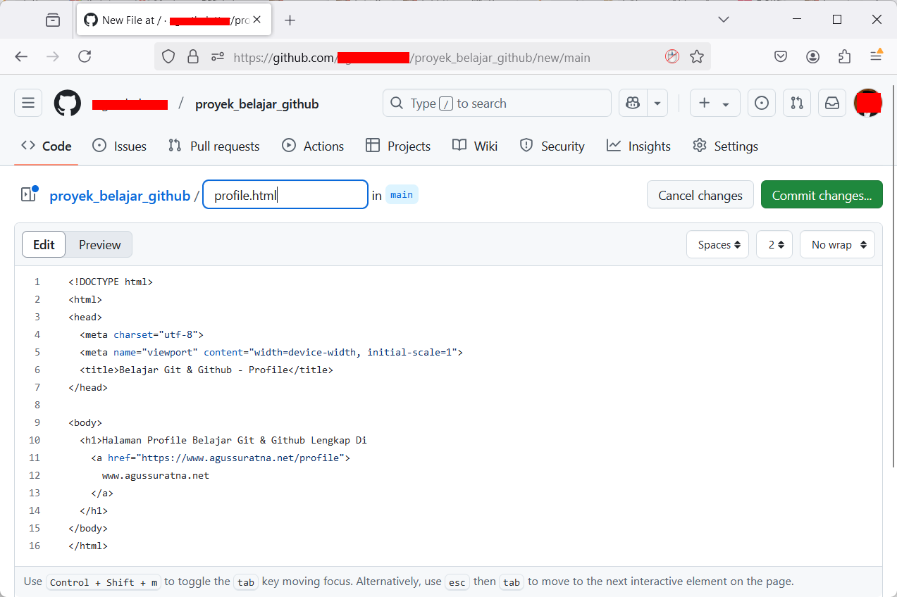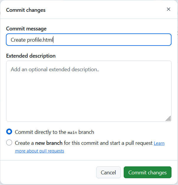 - Commit message isi dengan pesan commitnya, bisa diisi sesuai dengan pesan yang kita inginkan. Pilih commit directly to the main branch, jika commit mau pada branch yang bernama main. Kemudian klik Commit changes.