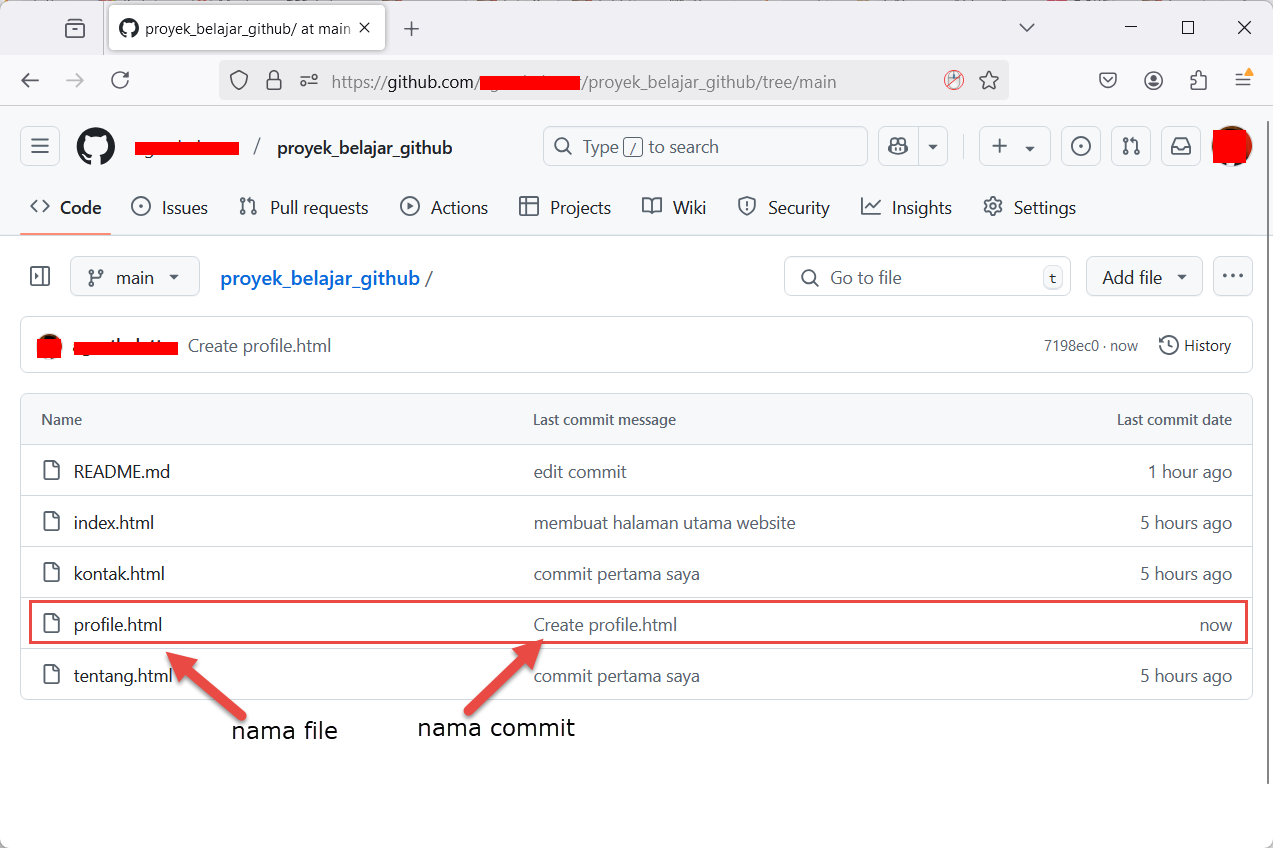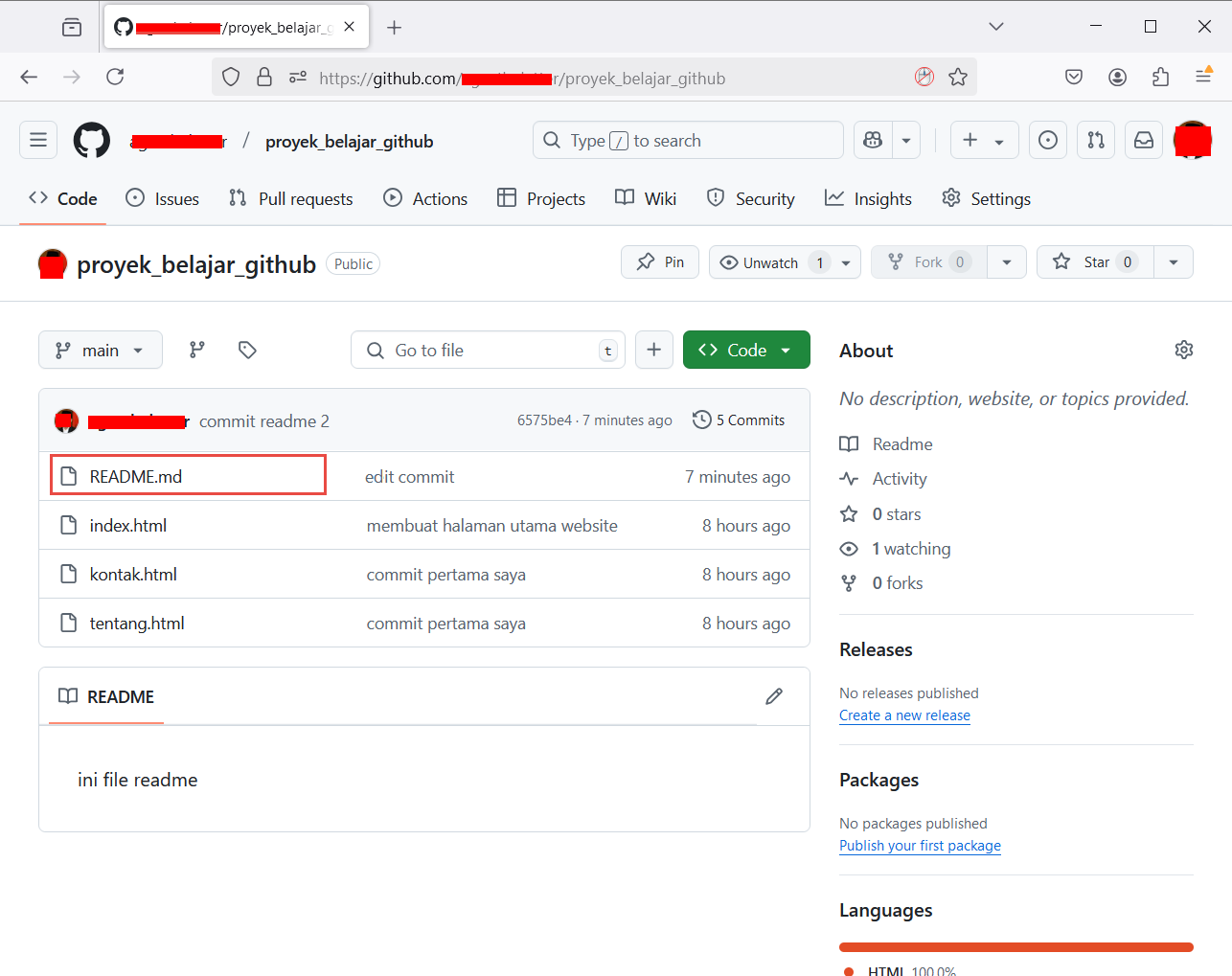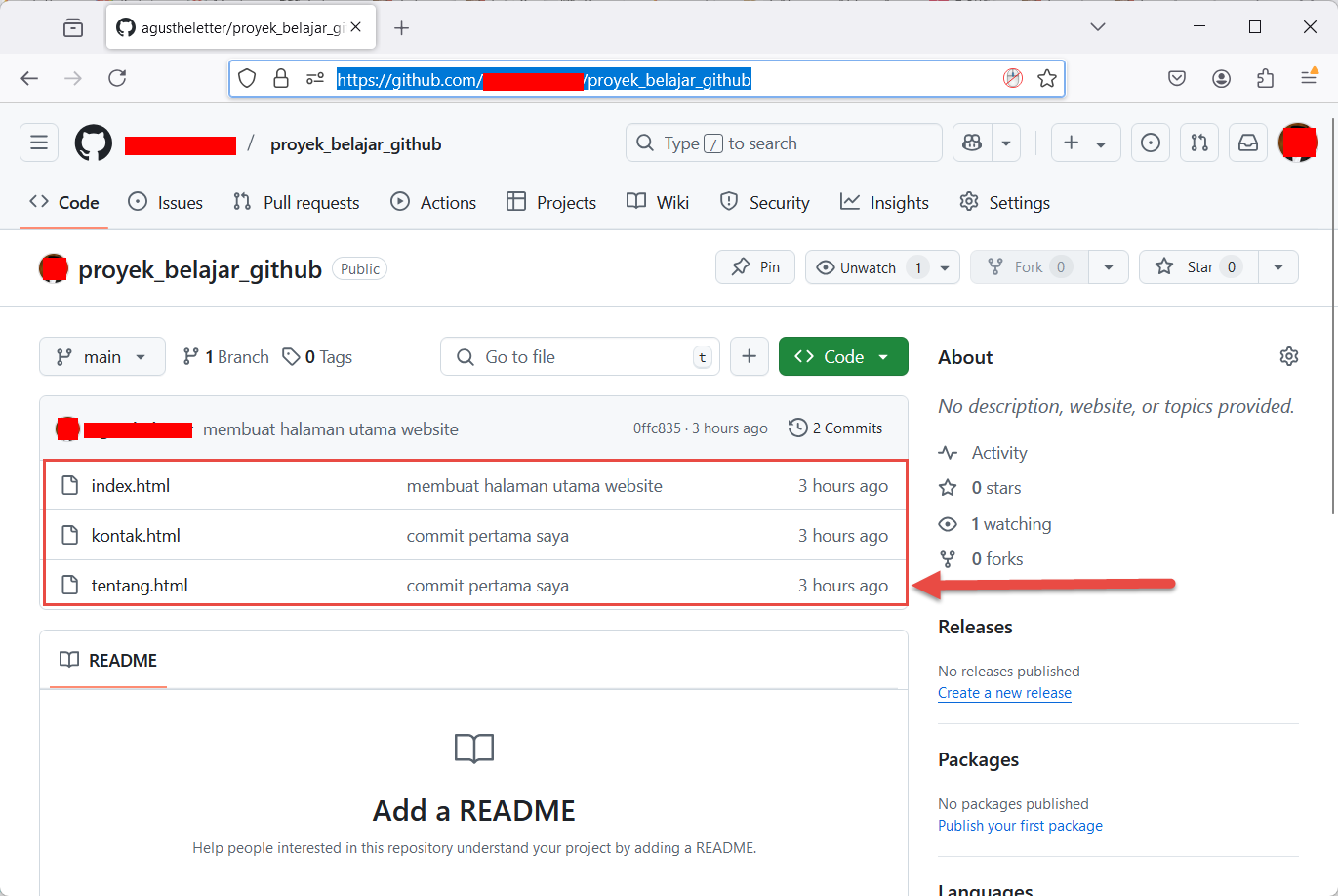 Tampak pada contoh di atas, file index.html, kontak.html dan tentang.html berhasil diupload ke repository github.