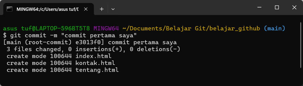 - Sekarang kita lakukan commit agar Git menyimpan semua perubahan tersebut. Gunakan perintah git commit untuk melakukan commit :