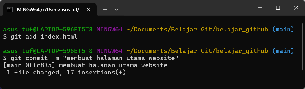 - Selanjutnya kita buat commit kedua, supaya kita bisa melihat riwayat perubahan revisi pada Git, kita coba buat commit kedua dengan mengubah salah satu file dalam repository belajar_github. Ubah file index.html yang tadinya kosong menjadi seperti berikut :