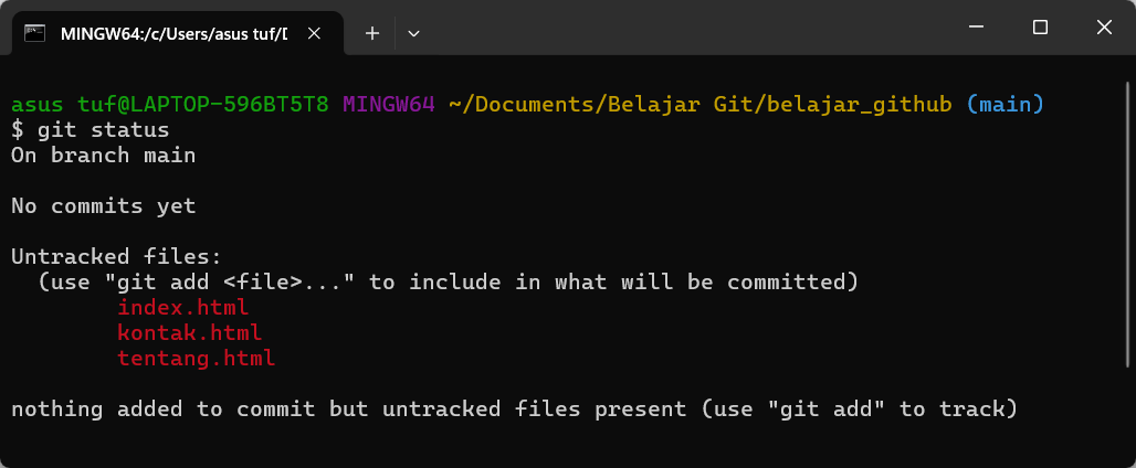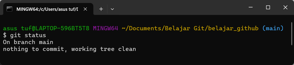 - Selanjutnya cek lagi status git proyek belajar_github tersebut :