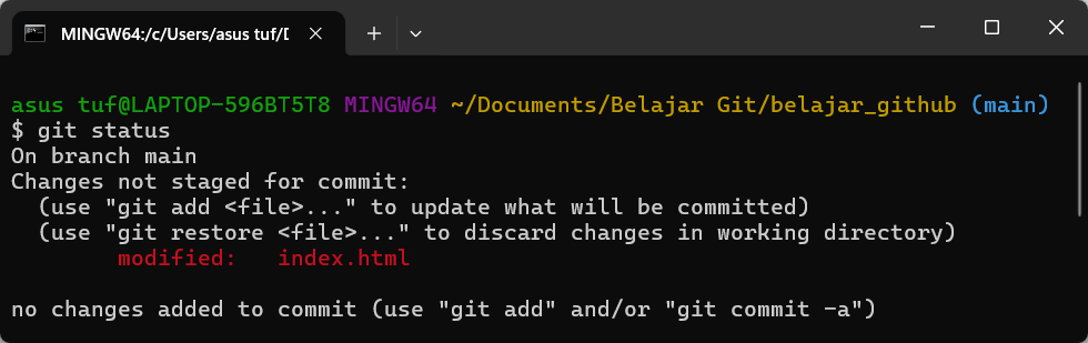 Sekarang status file index.html menjadi modified, karena sudah ada perubahan pada file tersebut tapi belum ditandai.