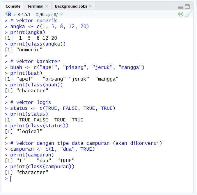 # Vektor numerik angka <- c(1, 5, 8, 12, 20) print(angka) print(class(angka)) # Vektor karakter buah <- c("apel", "pisang", "jeruk", "mangga") print(buah) print(class(buah)) # Vektor logis status <- c(TRUE, FALSE, TRUE, TRUE) print(status) print(class(status)) # Vektor dengan tipe data campuran (akan dikonversi) campuran <- c(1, "dua", TRUE) print(campuran) print(class(campuran)) # Output: "character"