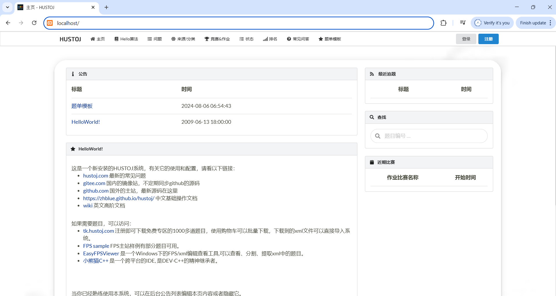 Jika muncul halaman login/register HUSTOJ, artinya instalasi berhasil.
